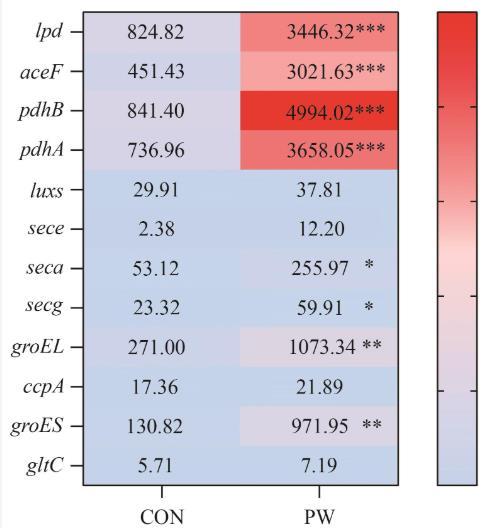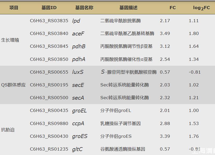 益生菌发挥益生作用,需要在环境中快速生长增殖成为优势菌群,因此生长速度是益生特性的筛选条件之一。TCA循环通路中pdhA、pshB、dlat、dld上调,该通路和细菌最基本的生长状态相关,能够影响生物体能量代谢,在一定程度上解释了L.reuteri 1.2838生长状态的变化原因。