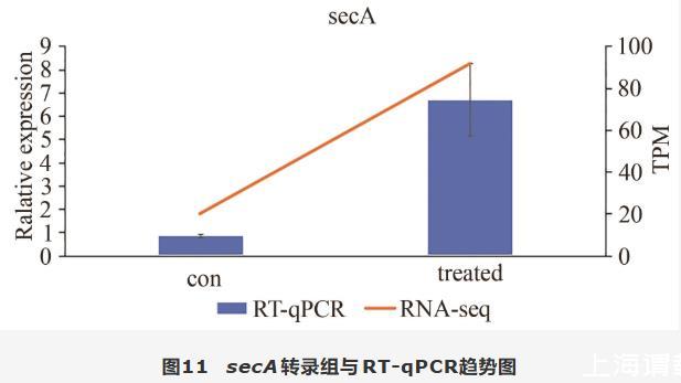 随机选择3个差异基因进行RT-qPCR验证,其中secA与群体感应相关,ndk与生长相关。结果如图9-图11所示,验证结果表明与对照组相比,给药组的dna K、ndk、secA基因均上调,RT-qPCR的结果与测序结果一致,表明本研究转录组测序结果可信度较高。