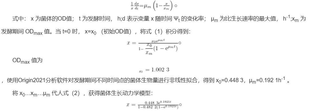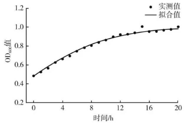 ODmax值为,使用Origin2021分析软件对发酵期间不同时间点的菌体生物量进行非线性拟合,得到x0=0.448 3,μm=0.192 1h-1。