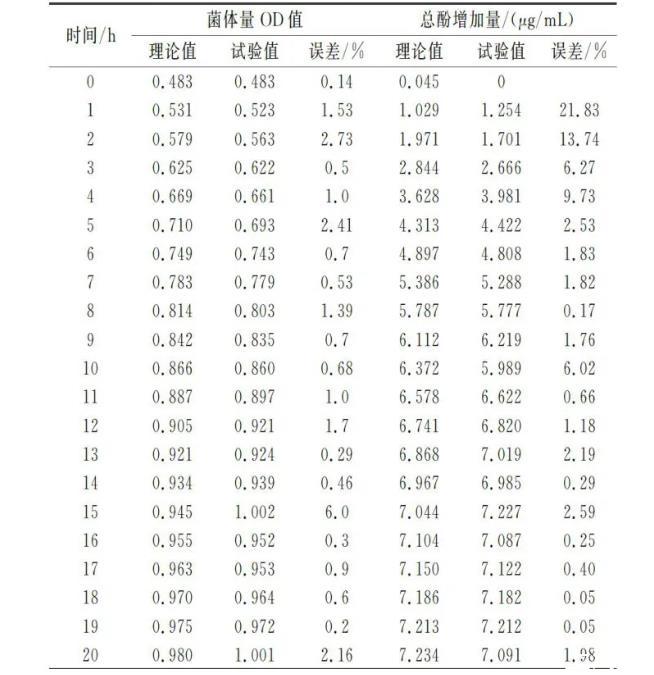 由表3可知,菌体生长模型和总酚增加量变化模型的理论值和试验值之间的平均误差仅为1.26%和3.77%,二者的平均误差均小于5%,充分证明了模型的拟合度较高,能够精准地描述红枣汁发酵过程中物质的动态变化。