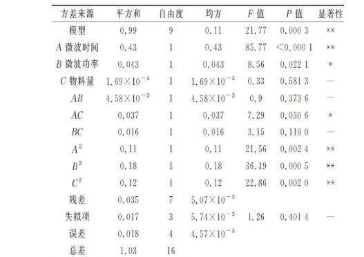 对多元二次回归拟合方程进行方差分析、显著性检验以及对各因素最佳值进行分析,结果见表3。