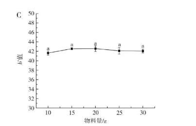 由图6可知,沙棘果粉的L*值、a*值、?b*值随着物料量的增加均无显著性变化(Pgt;0.05),说明10~30g物料量对沙棘果粉的色差没有明显影响。在相同微波能量和微波时间下,随着物料量的增加,微波效能对沙棘果粉色差的作用不显著。当物料量为10,15,20,25,30g时,ΔE分别为0.11,0.98,1.03,0.7,0.85。