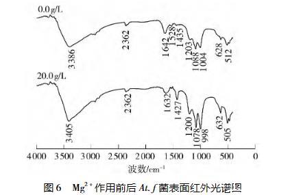 从图5中可以发现,At.f菌在Mg2?质量浓度为0.0 g/L体系中生长时的等电点为2.7,而在Mg2?质量浓度为20.0 g/L体系中生长时的等电点为3.6。等电点能指示一些官能团如羧基(—COOH)、氨基(—NH)和羟基(—OH)的存在,这些官能团存在于胞外多聚物中,并且决定细胞表面带何种电荷,因此At.f菌在不同生长条件下等电点的不同说明其胞外多聚物存在较大差异。等电点在pH=2.0~2.8之间说明细胞表面主要含葡萄糖酸或含其他与羧基相关的多糖,等电点在pH≥3.2时说明其细胞壁表面主要为蛋白质。这说明,高浓度Mg2?的存在使得细菌细胞壁表面成分发生了改变,这可以从宏观上解释细菌氧化活性降低的原因。