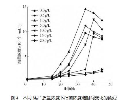从图4中可以看出:Mg2?质量浓度≤1.0 g/L时,细菌生长速度快,达到对数生长期的时间短,且随着离子质量浓度的增加,细菌浓度也增大,说明适量的镁离子能够促进细菌的生长;当Mg2?质量浓度超过1.0 g/L时,细菌生长受到抑制,延滞期增长,5.0、10.0 g/L Mg2?质量浓度条件下,均在40 h才达到细菌生长旺盛期,且Mg2?浓度越大,细菌浓度越低;当Mg2?质量浓度继续增大到15.0、20.0 g/L时,整个培养过程中,细菌浓度都偏低,说明此时细菌生长受到抑制。这是因为,Mg2?质量浓度过高导致细菌体内与溶液之间的渗透压增加,从而影响其正常的生理功能,或者影响其他物质代谢过程的进行,包括阻碍其他物质进入细胞、影响其他酶的代谢功能等,从而导致细菌的正常生长受到抑制。
