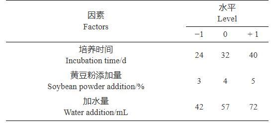 在初始固态发酵培养基的基础上,发酵条件单因素优化试验设置分别为:1)以加水量为唯一变量,分别加入24、36、48、60和72 mL蒸馏水,其他发酵参数不变,共5个处理组。2)以接种量为唯一变量,分别接入0.5、1.0、1.5、2.0和2.5 mL种子液,其他发酵参数不变,共5个处理组。3)以初始pH为唯一变量,分别用1 mol/L的稀盐酸和1 mol/L的氢氧化钠调节蒸馏水pH为3.0、4.0、5.0、6.0、7.0、8.0、9.0、10.0和11.0,其他发酵参数不变,共9个处理组。4)以培养时间为唯一变量,分别设定为7、14、21、28、35和42 d,其他发酵参数不变,共6个处理。5)以培养温度为唯一变量,分别将培养基置于22、25、28、31和34℃培养箱中黑暗培养,其他发酵参数不变,共5个处理。6)以光照周期为唯一变量,将培养箱的光照周期分别调节为24 h光照/0 h黑暗、18 h光照/6 h黑暗、12 h光照/12 h黑暗、6 h光照/18 h黑暗以及0 h光照/24 h黑暗,其他发酵参数不变,共5个处理。上述试验各组处理均重复3次。