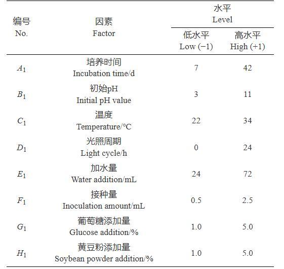 以单因素优化试验结果为基础,综合考虑发酵培养基和发酵条件对TCS007菌株粗提发酵产物产量的影响,选择8个影响显著的因素。根据Placket-Burman设计法,采用软件Design Expert 10针对选出的8个因素进行试验设计,以TCS007菌株粗提发酵产物产量为响应量,从A1-培养时间(7~42 d)、B1-初始pH(3.0~11.0)、C1-培养温度(22~34℃)、D1-光照周期(0~24 h光照)、E1-加水量(24~72 mL)、F1-接种量(0.5~2.5 mL)、G1-葡萄糖添加量(1.0%~5.0%)和H1-黄豆粉添加量(1.0%~5.0%)8个因素中确定各因素对粗提发酵产物产量影响的显著性,筛选关键因子。试验中每个因素取2个水平,即高水平“+1”和低水平“?1”(表1)。