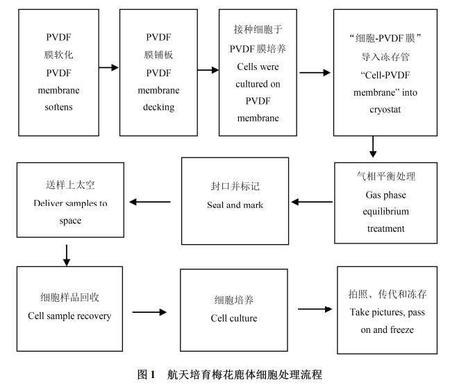 根据实验经费和实验材料的特殊性,此次实验按照本实验室自主研发的新型成纤维细胞在太空环境的聚偏二氟乙烯膜(polyvinylidene fluoride,PVDF)培养方法,将梅花鹿体细胞搭载于实践10号返回式科学实验卫星上,并在太空中飞行12 d后进行回收、培养和保存。具体实验方法参照用于航天生物育种的家畜成纤维细胞培养方法(内蒙古赛科星家畜种业与繁育生物学技术研究院有限公司2016),实验流程见图1。