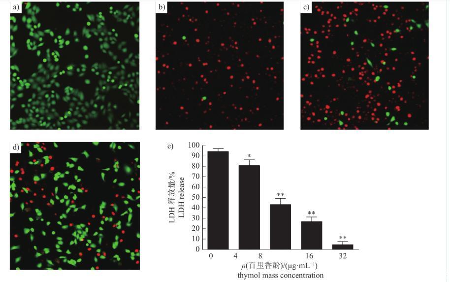 通过Live/Dead试剂盒染色,在激光共聚焦显微镜下可观察到绿色荧光的为活细胞,红色荧光的为死细胞。试验结果表明:百里香酚可以提高由金葡菌Hla介导的A549细胞损伤的保护率(图3a~d),随着百里香酚质量浓度的增加,死细胞数量减少,活细胞数量增加。