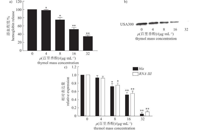 注:a)不同质量浓度百里香酚与金葡菌培养上清液对兔红细胞的溶血作用;b)不同质量浓度百里香酚对金葡菌USA300 Hla表达影响的免疫印迹结果;c)不同浓度的百里香酚对金葡菌USA300的hla和RNAⅢ相对基因表达量的影响。*.P<0.05,**.P<0.01;下同。
