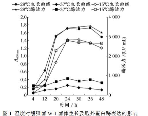 图1 温度对鳗弧菌W-1菌体生长及胞外蛋白酶表达的影响