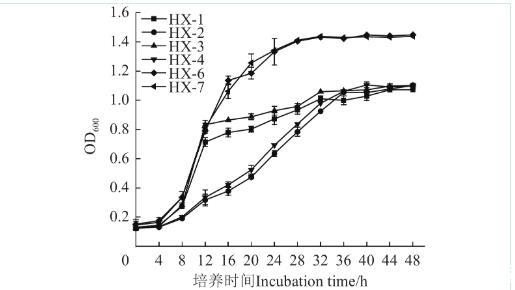 由供试NS菌株在YPD液体培养基中的生长曲线(图1)可知,同一种属菌株表现出相似的生长趋势,而不同种属间的生长情况有一定差异。其中T.delbrueckii菌株(HX-6、HX-7)在经历4 h延滞期后迅速进入对数生长期,28 h左右达到稳定期,最终OD600值达到1.4左右,生长速度和光密度值明显高于其他菌株;H.uvarum菌株(HX-1、HX-3)同样经历4 h延滞期后,在8~12 h期间生长速度较快、12~32 h期间生长较为缓慢并逐步达到稳定期;M.pulcherrima菌株(HX-2、HX-4)对数生长期持续时间较长,40 h左右达到稳定期,最大OD600值为1.102与1.098。