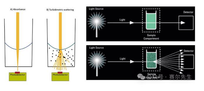 图1:吸光度和浊度散射的基本区别,在吸光度测定中,由于光被样品吸收,光电探测器中的光强会减弱(A);在浊度测定中,入射光由样本中的细胞/粒子随机产生散射。这将导致方向的不确定性。继续沿直线传播的光会进入检测器,光强也会减弱(B)