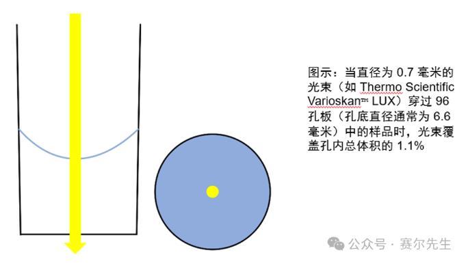 浊度测量总是在异质样品中进行,一般需要测量96/384孔板,现在多数酶标仪通常使用相当窄的测量光束。通常情况下,微孔板光度计的光束直径不到一毫米,当光束穿过96孔板的孔时,测量光束只能覆盖样品体积的很小一部分(图2)。另外,现代微孔板光度计的采样时间也很短,通常为毫秒级,这些对于浊度测量来说并不是最佳选择会增加变化。比如液体中的固体颗粒并非处于静止状态,而是在整个液体中自由漂浮。因此,当样品中只有少量固体颗粒时,在重复测量中,相同数量的颗粒出现在光束内的概率很低。如果样品中有100个颗粒,那么测量光束区域内的颗粒数最有可能是1个,但随机情况下可能是0个或2个,甚至3个。当采样时间也以毫秒为单位时,液体中颗粒的动态流动不会明显改变单个测量中的这种情况。因此,当OD值较低时,检测精度可能会明显降低,吸光度检测的CVs%也会大于正常值。