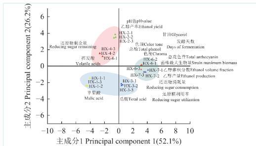 为了进一步明确各菌株与酿酒学参数的相关性,对各菌株处理酒样酿酒学参数进行主成分分析(图6)。HX-6和HX-7菌株聚集于PC1的正半轴,和甘油、乙醇体积分数、还原糖利用率、总酚、总花色苷等较多酿酒学参数密切相关。HX-1、HX-4菌株均分布在PC1负半轴,与挥发酸含量、pH值、乙醇产率和还原糖剩余量相关联。HX-1、HX-3菌株在PC1上被分离,其中HX-1与苹果酸含量相关性较强,HX-3与总酸含量强相关。