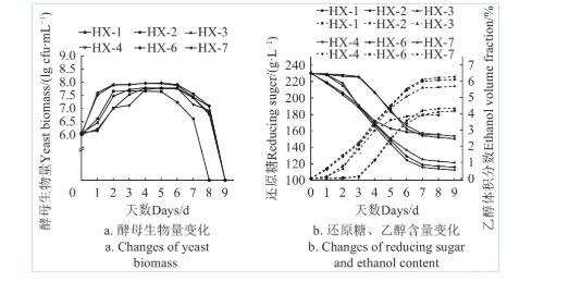 注:图b中实线表示还原糖含量变化,虚线表示乙醇体积分数变化。
