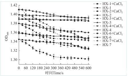 酵母菌株在发酵过程中形成絮凝体或絮凝物质的能力对葡萄酒发酵结束后的过滤除菌成本具有一定的影响。由图3可知,HX-1、HX-4、HX-6和HX-7菌株经CaCl2诱导处理后,出现了明显的絮凝现象。HX-2菌株在诱导后仅表现出轻微的絮凝作用,而HX-3菌株的絮凝性较低。