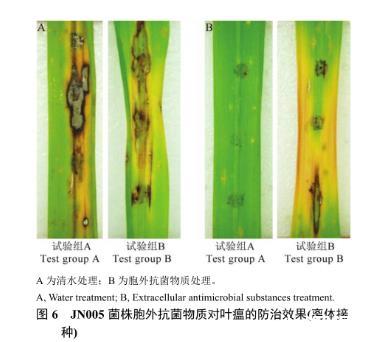 图6 JN005菌株胞外抗菌物质对叶瘟的防治效果(离体接种)A为清水处理;B为胞外抗菌物质处理。