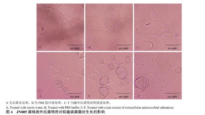 图4 JN005菌株胞外抗菌物质对稻瘟病菌菌丝生长的影响A为无菌水处理,B为PBS缓冲液处理,C~F为胞外抗菌物质粗提液处理。