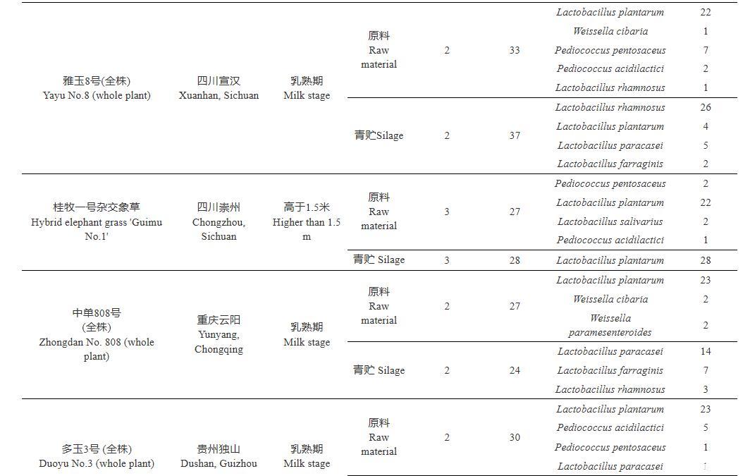 青贮是保持饲料营养价值最有效的技术之一,其品质取决于青贮自然发酵过程,即青贮后立即由同型发酵乳酸菌进行发酵,从而导致饲料酸化,抑制有害微生物生长。然而,在热带和亚热带地区难以生产出高品质的青贮饲料。这些地区在夏季大规模青贮生产过程中经常遭受高温和大量降水等不利天气条件,严重影响青贮发酵和有氧稳定性。青贮原料附生乳酸菌在生产优质青贮饲料中发挥着重要作用。然而,乳酸菌并不是植物上唯一的微生物,梭状芽孢杆菌、肠杆菌、酵母和霉菌也常生长于植物上,并与乳酸菌竞争水溶性碳水化合物(water soluble carbohydrate,WSC)。此外,植物上附着的天然乳酸菌种群因植物而异,数量从(1×102)~(1×109)cfu·g–1鲜样(fresh matter,FM)不等?;肪程跫不嵊跋熘参锷细阶诺娜樗峋俊6樗峋亢突钚允且种撇涣嘉⑸锷ず图跎俜⒔退鹗У囊桓鲋匾蛩?,自然发酵品质取决于青贮材料上初始乳酸菌数量和底物的含量。在温暖地区生长的青贮原料上附着的乳酸菌数量和种类比在寒冷地区的更多、更丰富。因此,了解湿热地区青贮原料上附着的天然乳酸菌组成是调制优质青贮饲料的前提。