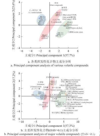 气味活性值(odor activity value,OAV)>0.1的化合物能够通过直接或协同作用直观表征葡萄酒中挥发性香气物质呈香特征。本试验中OAV>0.1的挥发性化合物共有22种,对其进行主成分分析(图8b)发现,除2株M.pulcherrima外,其余同一种属的菌株分布相对集中。2株T.delbrueckii分布在PC1的正半轴,与大部分发酵香气化合物相关联,其中HX-6菌株与苯乙醇、正己醛以及大部分乙基酯的生成强相关,HX-7处理与异戊醇、正庚醇及乙酸乙酯、乙酸苯乙酯、乙酸异戊酯等大部分乙酸酯的生成强相关;2株H.uvarum(HX-1、HX-3)主要与柠檬烯、芳樟醇与β-大马士酮的生成相关联;M.pulcherrima HX-2菌株与香茅醇、苯乙醇和辛酸乙酯等乙基酯的生成强相关,而HX-4菌株产香能力相对较弱。