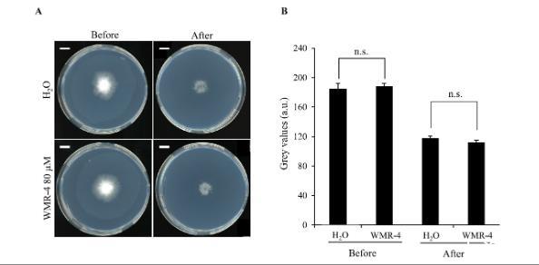 图3、WMR-4不抑制尖孢镰刀菌透膜性。A:尖孢镰刀菌在置于最小培养基(MM)上的纤维素膜上侵入性生长,无论是否使用80μM WMR-4。在拆除玻璃纸前后对板材进行成像,以观察玻璃纸穿透情况。比例尺,1厘米。B:定量灰阶分析显示与对照组相比,表面和渗透真菌生物量无显著减少。