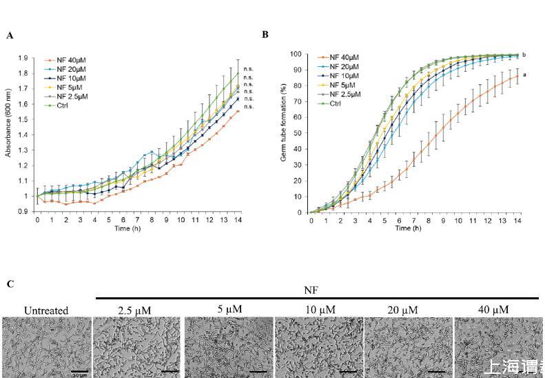 图5、NFs仅在高浓度下抑制尖孢镰刀菌生殖管的形成。A:生长动力学显示在测试的NF浓度(2.5–40微米)下,对真菌生物量积累影响极小。B:生殖管形成分析显示仅在最高浓度(40微米)下具有显著抑制效果。C:显微镜图像,确认浓度依赖性对萌芽形态的影响。比例尺=50微米。数据表示通过单向方差分析(ANOVA)±生物复制体的均值。