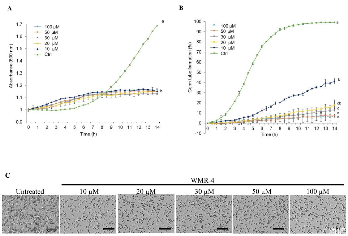 图1、WMR-4抑制尖孢镰刀菌的生长和生殖管形成。面板A:生长抑制动力学显示在所有测试浓度(10–100微米)下均显著减少生物质,30微米≥观察到平台效应。面板B:生殖管形成分析显示,浓度依赖性抑制,最大减少效果为≥30微米。面板C:代表性显微镜图像,显示在浓度范围内逐渐抑制萌发。数据代表了生物复制±标准差的指标。比例尺=50微米。