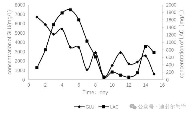 本次实验中,培养周期内细胞的生长曲线及活率变化曲线如图1所示。培养过程中细胞前期快速生长,最高细胞密度达1.88×107cells/mL,同时细胞活率维持在95%-100%之间,至第15天结束批次时细胞活率降至82%。葡萄糖及乳酸代谢曲线如图2所示,在培养过程中葡萄糖快速消耗,乳酸先累积再消耗。