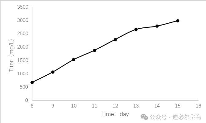 抗体表达量是抗体工艺中的关键目标参数之一,对于抗体工艺的建立与优化具有重要指导作用。在实验进行至第8天时,进行蛋白表达量的相关检测,并记录表达量(图3)。第8天至第15天,抗体产量逐渐增加,在第15天时表达量达到2.98g/L,表明在一次性细胞罐Endura SUB®3L中CHO-K1细胞同样能够正常完成相关抗体蛋白的合成。