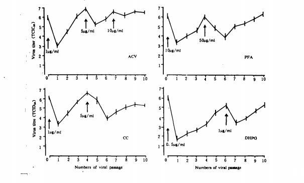 一.耐药株的培育结果HSV-1kos株与不同浓度药物共同培养,传代后,对ACV,CC,DHPG和PFA均可产生耐药性,但耐药性产生的时间和程度各有不同。ACV和DHPG耐药株产生较快,传代3~4次即可获得;CC和PFA耐药株产生较慢,需传代5~6次以上。耐药株的IC50较亲代株提高10~100倍。