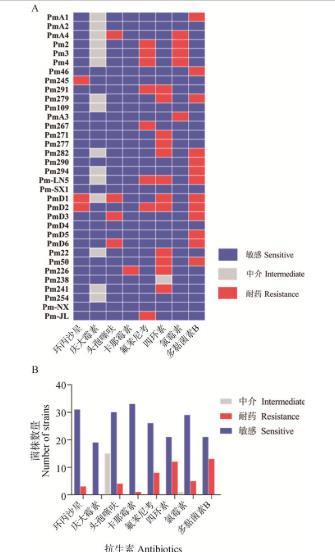 A.耐药性分析热图;B.34株Pm耐药性情况统计
