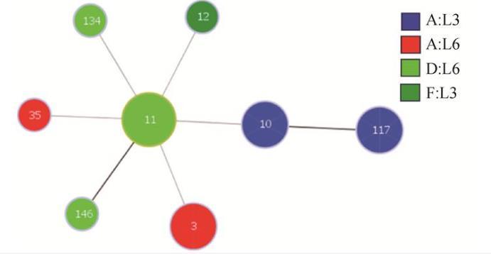 34株Pm鉴定出ST3、ST10、ST11、ST12、ST35、ST117、ST134和ST146 8种ST基因(图3),所占比例分别为17.65%、17.65%、35.29%、2.94%、2.94%、17.65%、2.94%、2.94%,ST11为优势序列型。通过PHYLOVIZ 2.0对MLST结果进行聚类分析(图4),34株Pm分布在一个克隆群,ST3型菌株主要为A:LPS3;ST10型菌株均为A:LPS6;ST11型菌株主要为D:LPS6;ST12型菌株主要为F:LPS3;ST35型菌株为A:LPS3;ST117型菌株均为A:LPS6(50%);ST134型菌株为D:LPS6;ST146型菌株为D:LPS6。