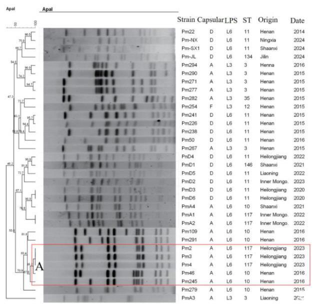 图3猪源多杀性巴氏杆菌PFGE聚类和MLST分型结果