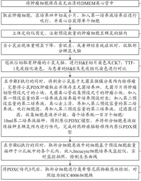 步骤G:在步骤F执行的同时,将剩余小鼠基于无菌显微镊分离颅内转移瘤,完整将小鼠PDX肿瘤取出并保存至无菌培养皿,无菌刀片将肿瘤切除预设尺寸的小块,无菌离心管收集预设尺寸的肿瘤小块,加入第一预设容量的第一培养液在培养箱中培养预设时长;加入第二预设容量的第二培养液,离心去上清,再加入第三预设容量的第二培养液,吹打细胞团,再加入第二预设容量的第二培养液,过滤器过滤,收集细胞悬液并计数,每个培养瓶一百万个细胞/10ml第二培养液接种,得到原位PDXC模型,并将部分细胞悬液继续接种至裸鼠颅内进行传代,完成耐药肺癌脑转移颅内原位PDX模型;