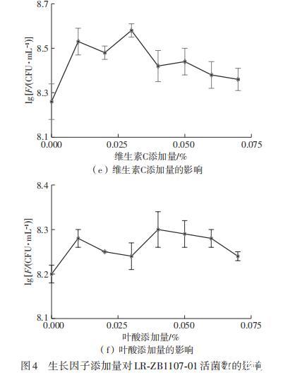 结果表明:在基础培养基中添加0.020%的硫酸锰时,LR-ZB1107-01的活菌数最多,达(5.07±0.37)×108 CFU/mL(如图4(a)所示);添加0.10%的硫酸镁时,活菌数达(3.87±0.19)×108 CFU/mL(如图4(b)所示);添加0.03%的D-异抗坏血酸时,活菌数最多,达(4.10±0.14)×108 CFU/mL(如图4(c)所示);添加0.06%的维生素B1时,活菌数达(4.43±0.65)×108 CFU/mL(如图4(d)所示);添加0.03%的维生素C时,活菌数达(3.80±0.29)×108 CFU/mL(如图4(e)所示);添加0.04%的叶酸时,活菌数达(2.04±0.16)×108 CFU/mL(如图4(f)所示)。