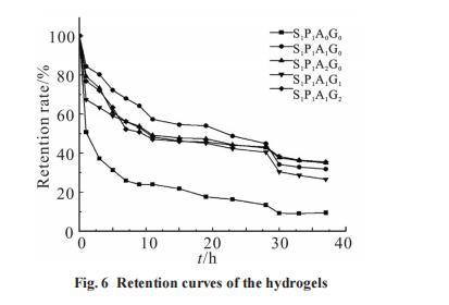 (2) 溶胀保水性能测试结果可知,水凝胶在PBS缓冲液中具有优异的溶胀保水性能,平衡溶胀率最高可达600%,是S1P1A0G0水凝胶的3倍,30 h后仍保有20%以上的含水量。