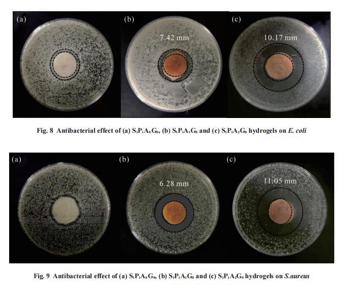 SPAG水凝胶抗菌性能测试结果见Fig.8和Fig.9。如图可知,S1P1A0G0水凝胶周围没有明显抑菌区域,说明无芦荟提取物添加的水凝胶本身抗菌性能弱;S1P1A1G0和S1P1A2G0水凝胶周围形成了明显抑菌圈,这是由于芦荟提取物其蒽醌结构上的羟基能有效杀灭细菌,使水凝胶具有较好的抗菌性能。与S1P1A1G0相比,S1P1A2G0的抑菌圈直径有所增加,水凝胶的抗菌性能增强。SPAG水凝胶具有良好的抗菌性能,可使伤口免受外部细菌侵害,减少炎症的发生,适用于伤口敷料等领域。