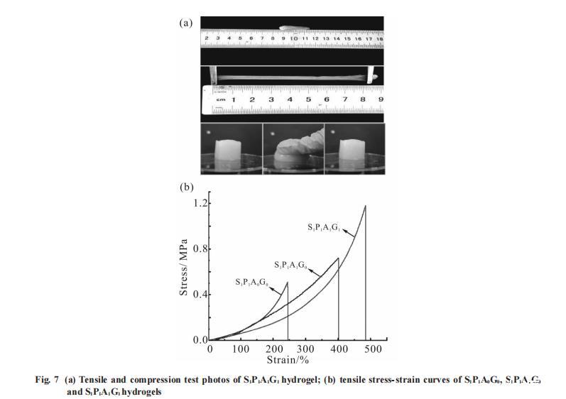 (3) 力学性能与TGA结果可知,S1P1A1G1水凝胶的拉伸强度为1.18 MPa,断裂伸长率为480%,水凝胶的热稳定性得到提升,300℃时质量保留率为80%。良好的力学与热性能使其可应用于柔性电子器件等领域。