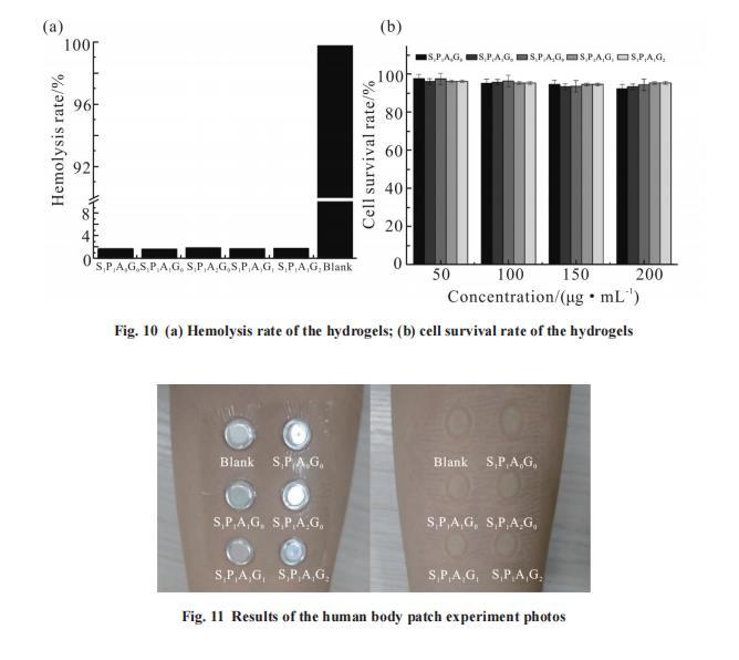 (4) 抑菌实验及生物相容性实验可知,水凝胶对大肠杆菌和金黄色葡萄球菌具有优异的抗菌效果(抑菌圈宽度分别为10.17 mm和11.05 mm),溶血率低(在2%以下),细胞存活率高(在89%以上),经人体斑贴实验验证了产品的安全性。SPAG水凝胶兼具良好的抑菌效果和生物相容性,在生物医学、日用化学品等领域具有广阔的应用前景。