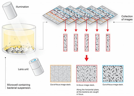 专利光学扫描技术在每个微孔内采集6.25°倾斜的三维Z型叠加序列图像,无需预处理、染色等操作步骤。倾斜使得在高浓度和低浓度的分析物(微生物、哺乳动物细胞、孢子、花粉等)下操作更加自由。图像采集过程随着时间的推移而重复,并且使用最佳聚焦图像的延时序列来生成视频。